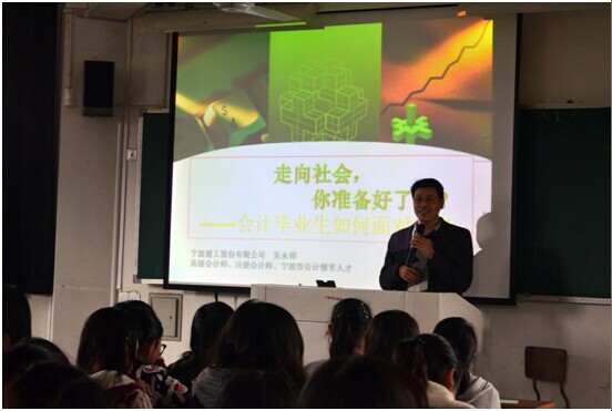 首先,吴老师向同学们阐述了出纳和会计的工作内容及工作要求,并解释为什么要这么做以及不做会带来哪些问题。接着,吴老师从他作为一个企业领导者的角度告诉同学们领导最看重新人哪些素质。道德是最重要的,这是做人的根本。在工作中,需要由衷而发地去工作,还要发挥团队精神。创新精神很重要,工作中,需要不停地融入新鲜元素,不能永远一成不变。紧接着,吴老师给同学们提出了些宝贵的建议。他告诫同学们,在职场上要先学会做人,处理好同事和领导的关系。失败是必然的,但是要永不言败,要勇敢地站起来,对自己说,没事,再来。随后,吴老师又送了同学们三句金句:你要行。别人觉得你行才行。觉得你行的人,他也行。吴老师告诉同学们,一定要充实自己的知识和本事,还要被有能力的人认同。吴老师以其扎实的理论知识、丰富的社会经验和真实的例子将会计和步入社会前的需要讲解得深入浅出,并从不同的角度表明了自己的观点,整场讲座精彩纷呈。过程中,吴老师不时以幽默风趣的语言解释,使得同学们轻松一笑后还记忆深刻。