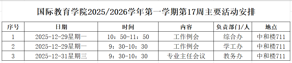 国际教育学院2025/2026学年第一学期第17周主要活动安排