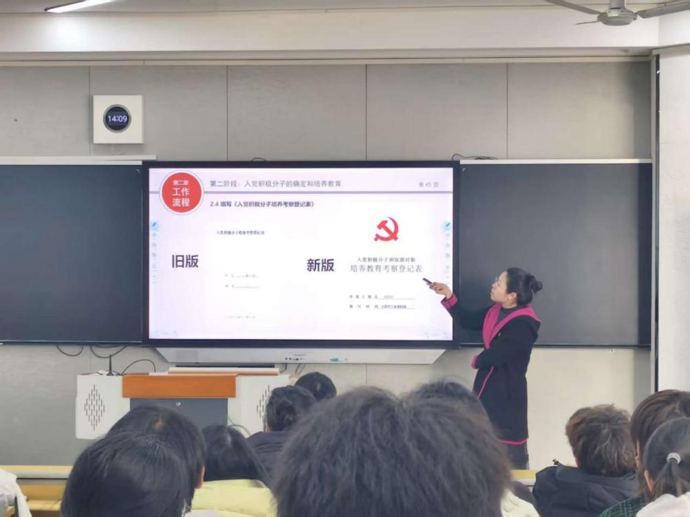 课堂上,王老师按照党员发展全流程,从申请入党、入党积极分子的确定和培养教育、发展对象的确定和考察、预备党员的接收、预备党员的教育考察和转正五个阶段,系统梳理了各环节的核心要求与关键节点。她重点讲解了入党申请书的撰写规范,强调入党申请书必须手写;明确了培养联系人的资格条件与职责;详细介绍了政治审查的主要内容与严肃性,强调“未经政治审查或政治审查不合格的,不能发展入党”;并结合实际案例,对《入党志愿书》的填写规范、支部大会讨论的“双过半”原则等作了生动讲解。